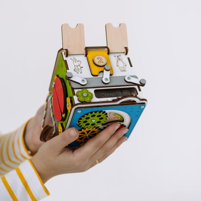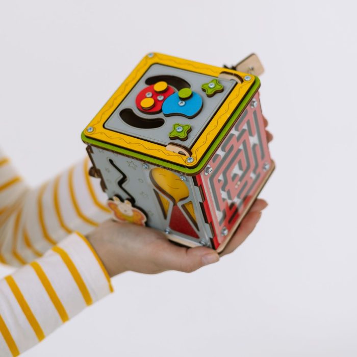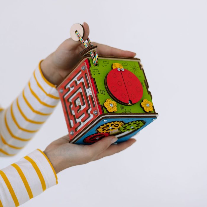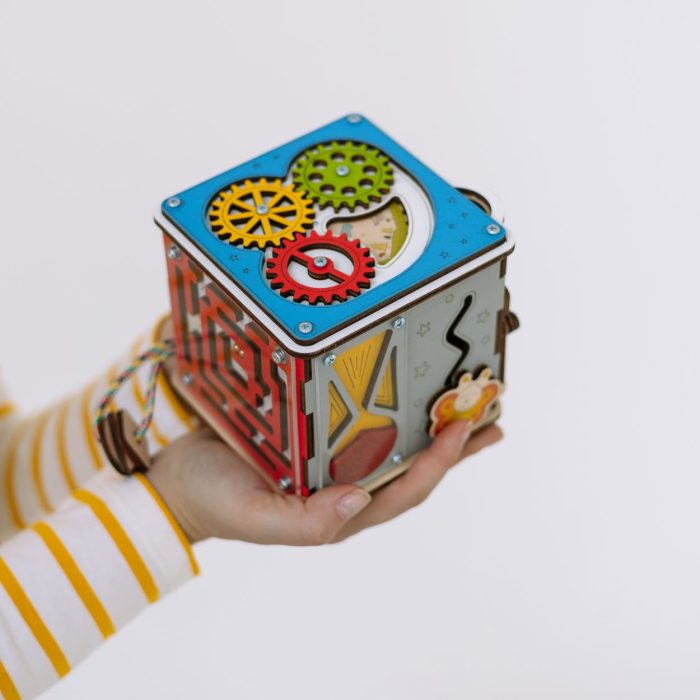 БизиКуб не только увлекательный спутник в домашних посиделках и любых путешествиях, но и легкая, небольшая по размеру и безопасная для детских ручек игрушка-развивашка.