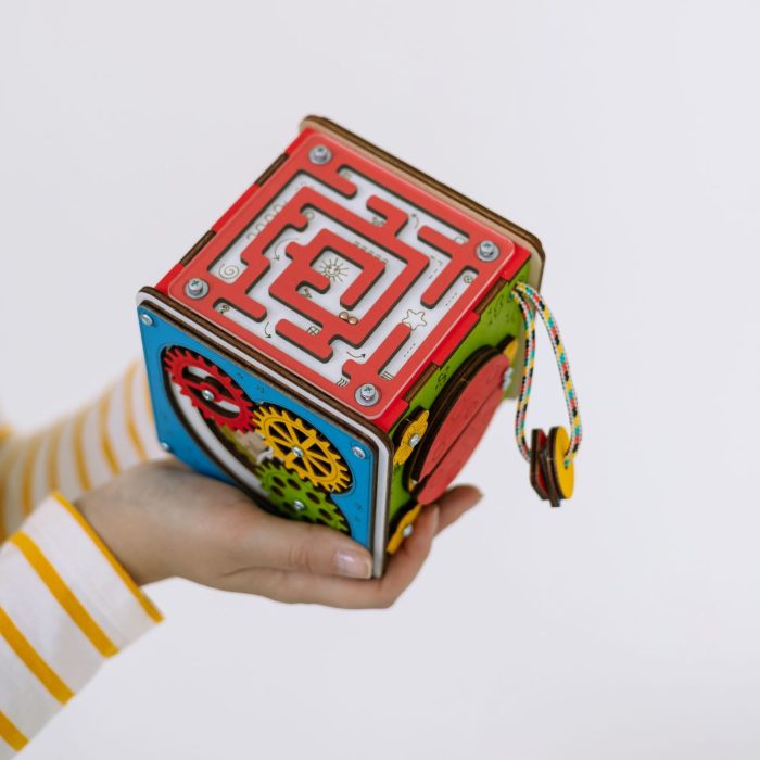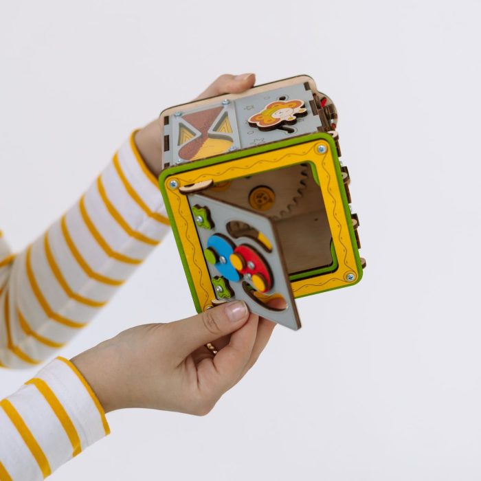 Дизайн: яркий БизиКуб с акцентом на ключевые цвета, которые легче и быстрее воспринимаются детским зрением, – желтый, синий, зеленый и красный.